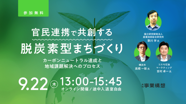 学校法人先端教育機構 事業構想大学院大学(本部:東京都港区、学長:田中里沙)出版部が発行する「月刊事業構想」の主催で、脱炭素と地域活性をつなぐ官民連携をテーマにしたオンラインセミナーを、9月22日(木)に開催します。