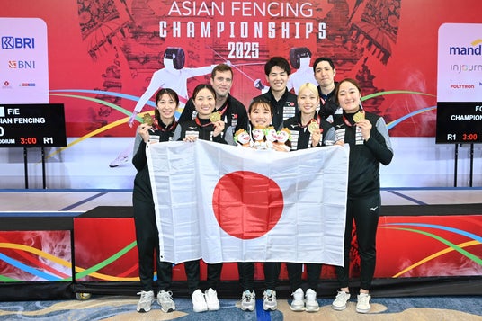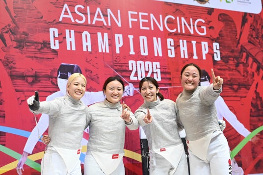 現地時間2025年6月21日(土)、インドネシアで開催された、アジア選手権 女子サーブル団体で江村 美咲(立飛ホールディングス株式会社)、尾崎 世梨(株式会社ミキハウス)、金子 優衣奈(日本大学/株式会社ミキハウス)、佐野 佑衣(オリエンタル酵母工業株式会社)のメンバーで本大会初の金メダルを獲得しました!
