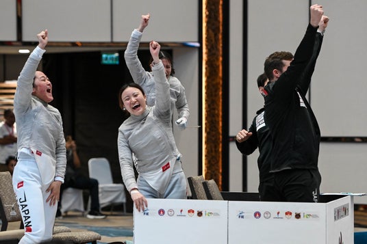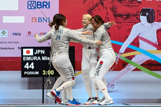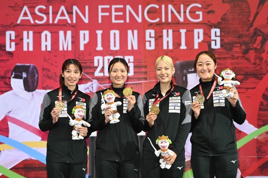 今大会をワールドランキング(WR)5位で迎えた女子サーブルチームは、準々決勝でシンガポール(WR27位)に45対16で圧勝。準決勝では中国(WR7位)に45対35で勝利。決勝では韓国(WR4位)に中盤リードを許したものの追いつき、45対44で競り勝ち、見事、金メダルを獲得しました。