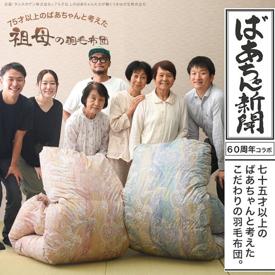 「タンスのゲン」 創業60周年を記念して、75歳以上のばあちゃん達が活躍する「うきはの宝」とコラボレーション!60年以上の人と技術の歴史が生み出す本格的な羽毛布団が誕生。
