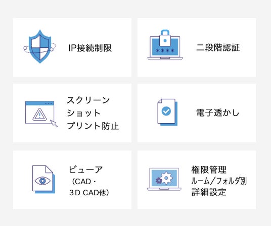 ・アクセス権限管理:ユーザーごとに細かくアクセス権限を設定でき、特定のデータに対して、閲覧、ダウンロード、印刷などの権限を設定することが可能です。