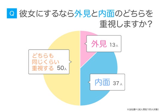成人男性100人に「彼女にするなら、外見と内面のどちらを重視しますか?」と尋ねたところ、「内面」が37人(37.00%)、「どちらも同じくらい重視する」が50人(50.00%)という結果になりました。