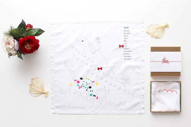 CLASSICS the Small Luxury (クラシクス・ザ・スモールラグジュアリ)は、東京、日本橋人形町を拠点に、日本のハンカチーフ業界のパイオニアである、繊維製品企画販売のブルーミング中西株式会社(本社 東京都 中央区 取締役社長 中西一) が運営する、ハンカチーフ専門店です。新たな年を迎える準備におすすめのカレンダーハンカチーフと2023年の干支うさぎをモチーフにした新作ハンカチーフを発売しました。