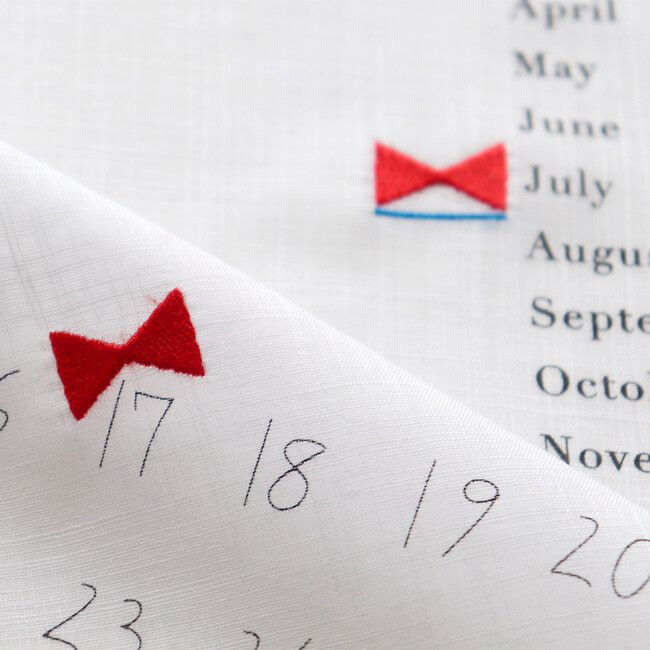 KIGI(キギ)のアートディレクター、渡邉良重さんがデザインしたカレンダーハンカチーフ。大切な記念日にリボンの刺繍で印がつけられます。
