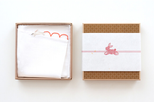和柄の「ねじり梅」のハンカチーフに、うさぎのモチーフ刺繍をお入れして、新年のご挨拶の贈り物に。