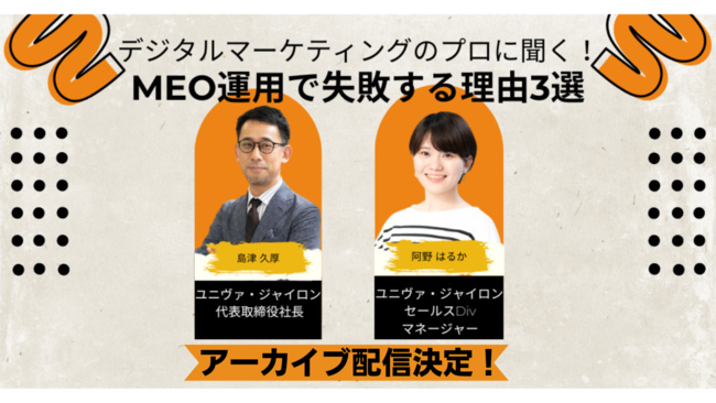 株式会社営業ハック(本社:東京都港区・代表:笹田裕嗣)と株式会社ユニヴァ・ジャイロン(本社:東京都港区・代表:島津久厚)共同で開催したウェビナーが、好評につきアーカイブ配信することとなりました。申込み期日は2023年3月31日(金)まで、お申し込みは無料です。インバウンドマーケティングをサポートするウェブサイト改善エンジンGyro-nを提供する株式会社ユニヴァ・ジャイロンからは代表の島津様・セールスDiv. マネージャーの阿野様、株式会社営業ハックからは代表の笹田が登壇し、ベストなMEO運用の仕方について語りました。ぜひご覧ください!