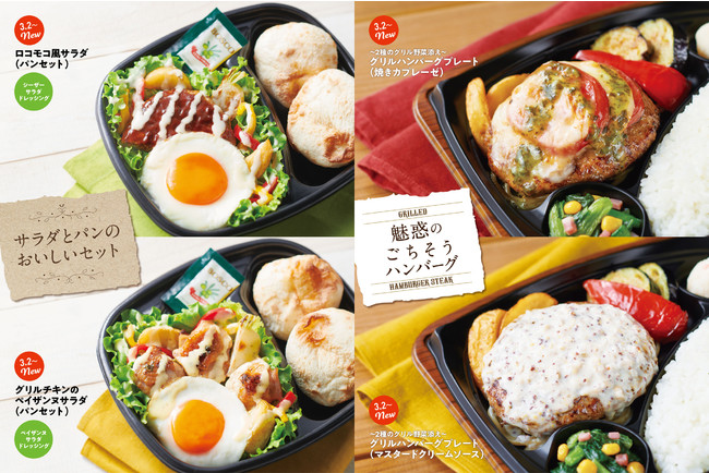 「ほっともっとグリル」では、野菜と肉系のおかずを楽しめる『グリルチキンのペイザンヌサラダ(パンセット)』590円と、『ロコモコ風サラダ(パンセット)』590円を、3月2日(水)より新発売いたします。また同日より、店内のオーブンで焼き上げるふっくらジューシーなハンバーグが人気の『グリルハンバーグプレート』の新味として、『~2種のグリル野菜添え~グリルハンバーグプレート(焼きカプレーゼ)』890円と、『~2種のグリル野菜添え~グリルハンバーグプレート(マスタードクリームソース)』790円も、併せて新発売いたします。