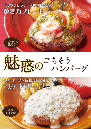 ホワイトソースに粒マスタードソースを加えたこだわりのソースを、ハンバーグにたっぷりとかけました。甘みの中にマスタードの酸味と香りが溶け込んだ、濃厚でまろやかな味わいのソースがハンバーグの美味しさを引き立てる、満足感のある仕立てです。