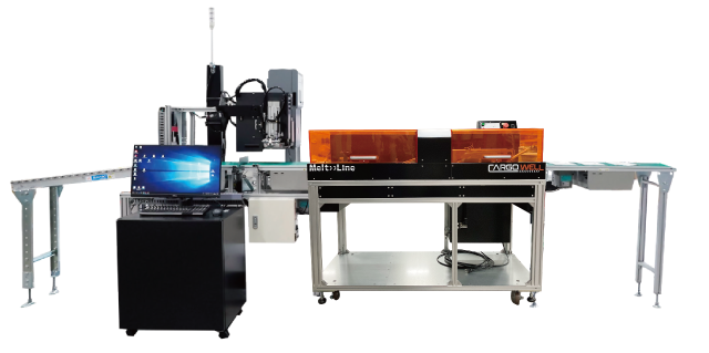 1時間に1000個の自動梱包が行える全長約3.5mのとてもコンパクトな梱包ラインです。