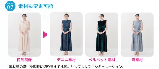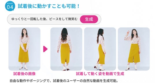 「AI服試着ツール」は、1枚の写真からさまざまなデザインやカラーの衣服を瞬時に試せるソリューションです。リアルに近い試着体験を実現し、購入前の不安を軽減するとともに、オンラインショップや店舗での顧客エンゲージメントを高めます。これにより、ファッション業界における新しい購買スタイルの創出をサポートします。