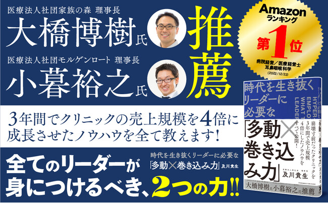 株式会社クロスメディア・パブリッシング(東京・渋谷区、代表取締役・小早川幸一郎)は、2022年12月23日に書籍『時代を生き抜くリーダーに必要な「多動×巻き込み力」』を刊行します。本書はクリニックのリーダーとして著者が経営を立て直したノウハウを語り尽くした一冊です。