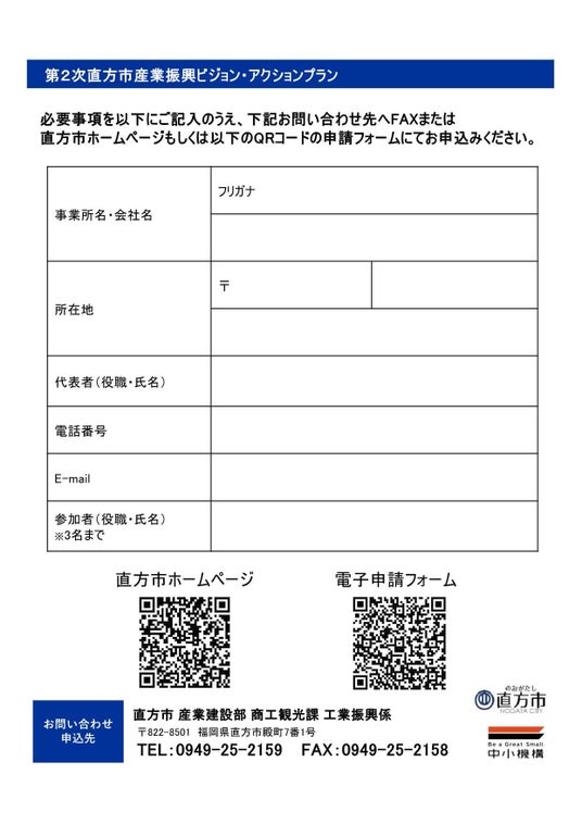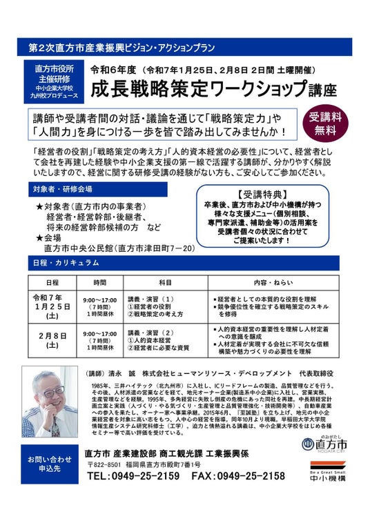 令和5年3月に策定いたしました「第2次直方市産業振興ビジョン・アクションプラン」の中に定めている「革新と挑戦で、新たな価値を生み出す」ことを目指して、実施する事業です。自社の成長戦略プランを描き、事業成長へと繋げて行くため、市内企業10社程度に対して、自社の成長戦略プランを策定するワークショップを開催するものです。「経営者の役割」「戦略策定の考え方」「人的資本経営の必要性」について、経営者として会社を再建した経験や中小企業支援の第一線で活躍する講師が、分かりやすく解説いたしますので、経営に関する研修受講の経験がない方も、ご安心してご参加ください。