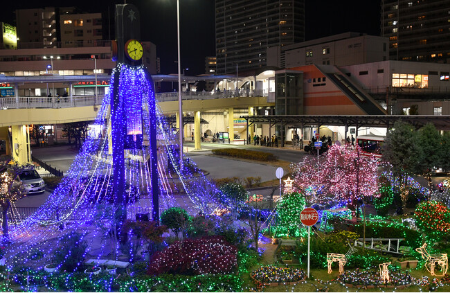JR高槻駅南側ロータリーに、この時期恒例のイルミネーションが登場。時計塔や花壇などが富士山や桜などのデザインに装飾され、たくさんのLEDライトが冬夜の高槻を彩っています。