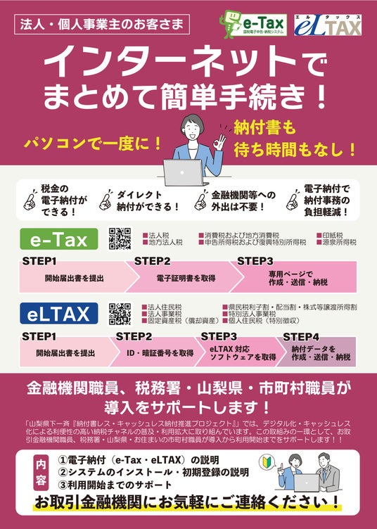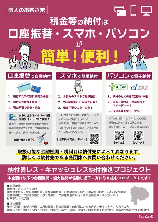 株式会社山梨中央銀行(頭取 古屋 賀章)は、昨年度に引き続き、山梨県、県内全27市町村および県内に本・支店を置く全金融機関ならびに経済機関等との協働による「山梨県下一斉『納付書レス・キャッシュレス納付推進プロジェクト』」を実施いたします。