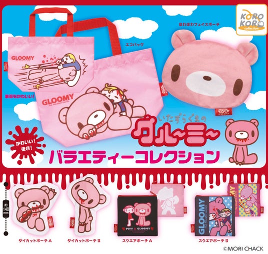 横幅28cmでマチ付きがうれしい「エコバッグ」、グルーミーのちょっと危険なシルエットが可愛い「ダイカットポーチ」(2種)、ふわふわなボア生地を使用した「ほわほわフェイスポーチ」、グルーミーと飼い主ピティー君の刺激的な友情を感じられる両面デザイン仕様の「スクエアポーチ」(2種)の全6種展開。