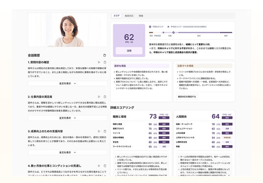 本サービスの面談では、AIとの自然な音声対話により、率直な自己開示を可能とし、社員の本音を引き出します。その上で、面談データをもとにAIが各社員の状態を即座に自動で分析。レポート画面では、その時々の状態や変化だけでなく、具体的な課題や改善策まで、ひと目で把握することができます。