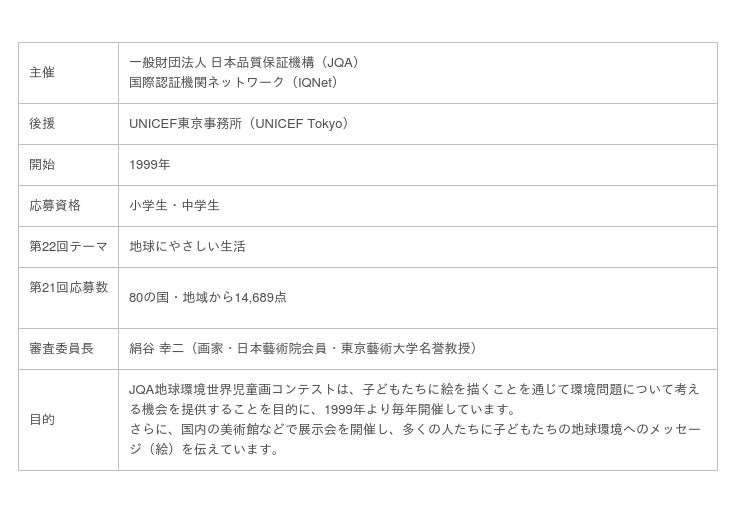 一般財団法人 日本品質保証機構(東京都千代田区、理事長:小林 憲明、略称:JQA)と国際認証機関ネットワーク(スイス・ジュネーブ、略称:IQNet)が主催し、UNICEF東京事務所(東京都渋谷区)の後援による「JQA地球環境世界児童画コンテスト」は、1999年より開催しており、現在22回目の作品を募集しています。