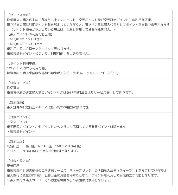 楽天証券株式会社(代表取締役社長:楠 雄治、本社:東京都世田谷区、以下「楽天証券」)は、2018年9月30日(予定)より、投資信託の積立において、楽天スーパーポイント(以下、「楽天ポイント」)※1及び楽天証券ポイントを「1ポイント=1円」として、購入代金の全額または一部に利用できるサービスを開始することをお知らせします。