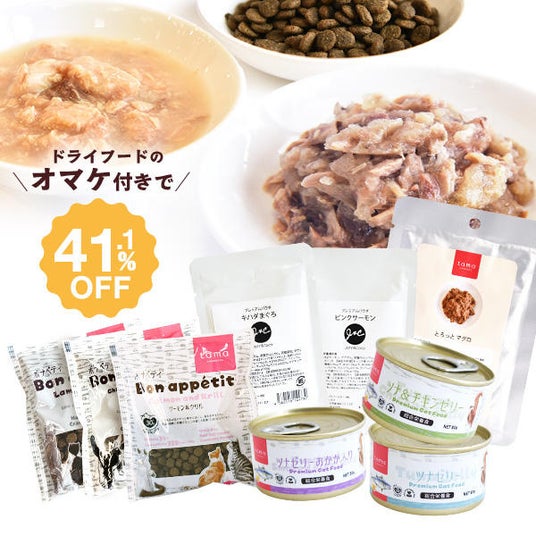 普通に食べるだけで水分補給に役立つウェットフードの特別セットです。バラエティ豊かな6種のウェットフードのセットです。さらに、ドライフードのお試しサイズ3つのオマケ付きでお届けます。通常価格1,444円のところ850円でのご提供です(41.1%オフ)。