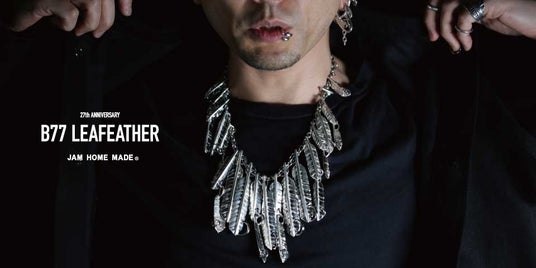 27周年を迎えるJAM HOME MADEは、00年代にBANANAをモチーフにエポックメイキングなシルバーアクセサリーの表面加工処理を発表しました。それは「二重塗装」。貴金属に塗装する事が、前代未聞でタブーだった時代に、使い続ける事で、段々塗装が剥がれ、バナナが熟れていく経年変化と重ねてポップに表現しました。その後も、BANANA LEAF(=バナナの葉)をFEATHER(=羽根)に見立てたアクセサリーを展開。20年前の話です。