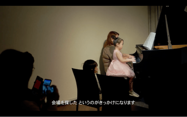 娘のやりたいという思いを形に残すためピアノのあるスペースで家族のピアノ発表会を行う様子、