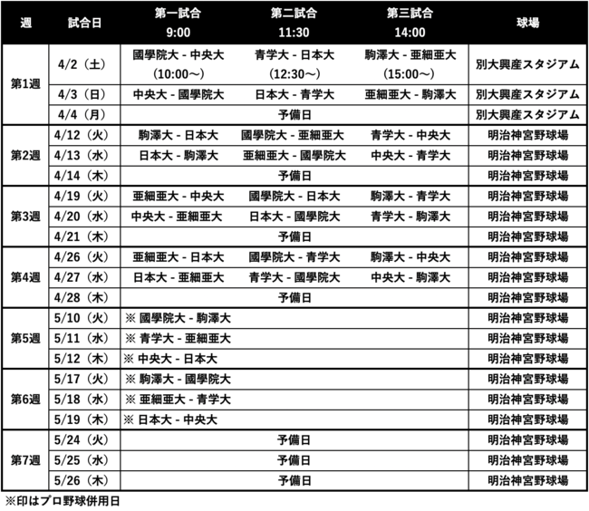 ※原則として、試合開始時刻の通りに試合の開催を予定しておりますが、雨天、その他の理由が生じた場合、最大で15分試合開始を早める場合がありますのでご了承ください。