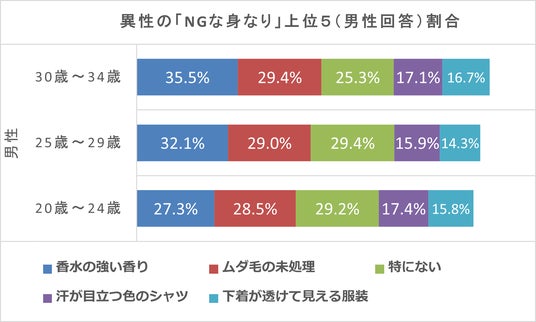 異性のNGな「身だしなみ」として最も多い回答は「香水の強い香り」!2番目に多い回答は夏の時期だからこそ気になる「〇〇〇の未処理」!?異性の「身だしなみ」への意識は女性20代と30代で格差あり!?