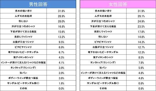 まず、男女ともに一番多かった回答としては、「香水の強い香り」という選択肢で、男性では31.6%、女性では31.9%という結果となり、ほぼ同数の回答ボリュームとなりました。夏の時期の発汗へのエチケット感覚から、体臭予防策として香水を使用する機会も多くなる時期ではありますが、使用方法を間違ってしまうと、男女いずれの場合でも不快感を与えてしまっているということがわかる回答結果となりました。