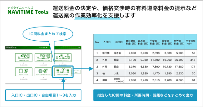株式会社ナビタイムジャパン(代表取締役社長:大西啓介、本社:東京都港区)は、2022年12月20日(火)より、サイト上でCSVファイルをアップロードするだけで使える業務支援Webサービス『NAVITIME Tools』にて、複数のIC(インターチェンジ)間の料金をまとめて検索できる機能を提供開始いたします。