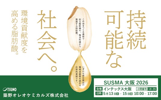 築野オレオケミカルズ株式会社(本社:和歌山県伊都郡 代表取締役社長 築野富美 https://www.tsuno.co.jp/ )は、2026年5月13日(水)から15日(金)にインテックス大阪で開催される「第6回サステナブルマテリアル展[大阪]SUSMA(主催:RX Japan株式会社)」に出展いたします。今回の展示では、「国内生産、米ぬかの非可食部、廃食用油、バイオマス」をテーマに、環境に優しい製品ラインアップや最新の技術ソリューションをご紹介します。ぜひ当社ブースにお立ち寄りいただき、未来を共に創るパートナーシップの可能性をご体感ください。