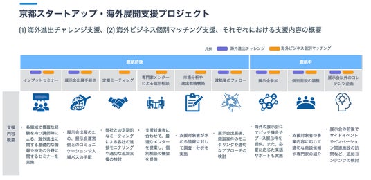 本プロジェクトは、世界で活躍するスタートアップの創出・成長を目的に、京都市内の有望なスタートアップ企業を対象とし、海外展示会への出展や個別マッチングによる実践的支援を通じて、海外での販路拡大・売上確保を目指すものです。