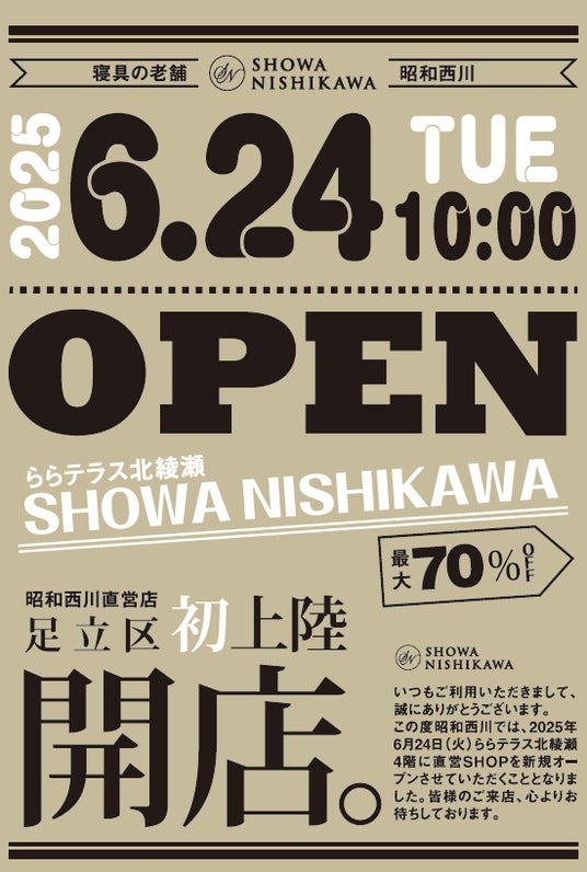 昭和西川株式会社(東京都中央区、代表取締役:西川 惠)は2025年6月24日(火)、足立区・北綾瀬の新たなランドマーク「三井ショッピングパーク ららテラス北綾瀬」に新店舗をオープンいたします。足立区初となる新店舗ではムアツマットレスや羽毛ふとん、オーダーメイドまくらをはじめとする快眠アイテムを取りそろえ、専門スタッフが一人ひとりの睡眠スタイルに合わせた寝具選びを丁寧にサポートいたします。