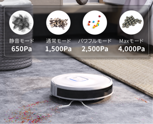 市販のロボット掃除機の最大吸引力は、一般的に2,500Pa~3,000Pa程度のものが多いですが、neabot Q11はその中でもトップクラスの4,000Paの吸引力を実現しました。