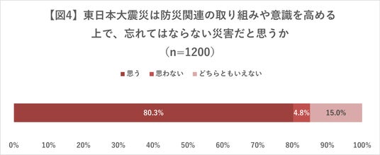 - 東日本大震災は、「防災関連の取り組みや意識を高める上で、忘れてはならない災害だと思うか」どうかについて尋ねると、「思う」と回答したのは全体の80.3%(963人)に上った【図4】。