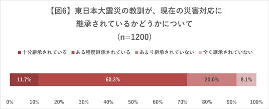 今回の調査結果では、発災から15年を迎える東日本大震災について、全体の約6割がそれぞれの人生に影響を与えたと考えていることが分かりました。さらに、防災への意識や取り組みを高めていく上で、忘れてはならない災害だと考えている方が8割超に上ることも判明しました。被害の大きさにより、震災が人々の胸に深く刻まれていることがうかがえましたが、当時の教訓が現在の災害対応に継承されているかに関しては、およそ4人に1人が継承されていないと答える現状も明らかになり、改めて当時の記憶を継承し、対策に生かしていくことの難しさが読み取れる結果となりました。