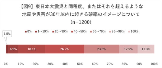 - 「東日本大震災と同程度、またはそれを超えるような地震や災害が再び発生する」と思う人は、全体で84.1%(1009人)。反対に、思わない人は15.9%(191人)だった【図8】。また、上記のような地震や災害が30年以内に起きる確率のイメージについて尋ねると、「60%未満」と回答したのは全体で52.7%(632人)。反対に、「60%以上」と回答したのは47.3%(568人)だった【図9】。