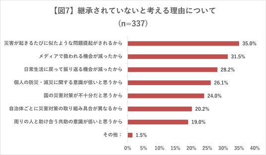 - 東日本大震災の教訓が現在の災害対応に継承されているかどうかについて、「継承されている」と考える人は71.9%(863人)だった。反対に、「継承されていない」と考える人は28.1%(337人)と、4人に1人以上が回答した【図6】。継承されていないと考える人の理由は、「災害が起きるたびに似たような問題提起がされるから」が35.0%(118人)で最多。順に、「メディアで扱われる機会が減ったから」が31.5%(106人)、「日常生活に戻って振り返る機会が減ったから」が28.2%(95人)などと続いた【図7】。