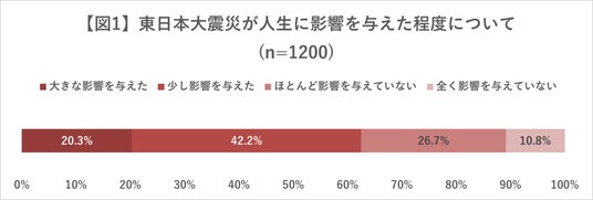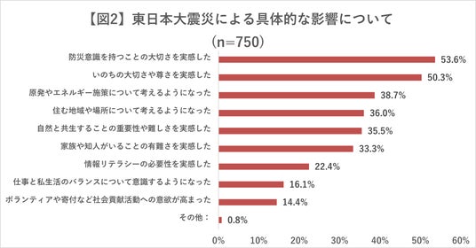 - 東日本大震災が与えた人生への影響について尋ねると、「影響を与えた」と回答したのは全体の62.5%(750人)。反対に、「影響を与えていない」と回答したのは37.5%(450人)だった【図1】。上記の750人に対して具体的な影響を尋ねると、「防災意識を持つことの大切さを実感した」が53.6%(402人)で最多。順に、「いのちの大切さや尊さを実感した」が50.3%(377人)、「原発やエネルギー施策について考えるようになった」が38.7%(290人)などと続いた【図2】。