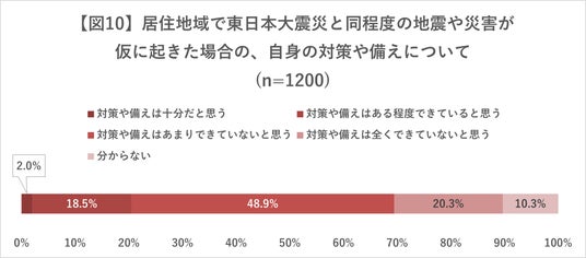 - 東日本大震災と同程度の地震や災害が仮に起きた場合の、自身の対策や備えについて尋ねると、「対策できている」などと回答したのは全体で20.5%(246人)だった。これに対し、「対策できていない」と回答したのは69.2%(830人)、「分からない」と回答したのは10.3%(124人)だった【図10】。