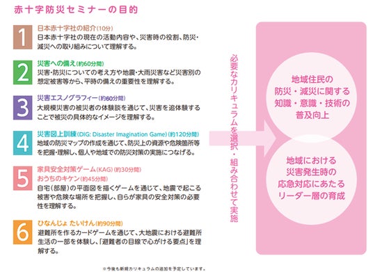 日赤では、数々の災害で活動してきた教訓を踏まえ、人々の防災に関する知識、意識、技術を高め、また、地域コミュニティ形成の一助となることを目的に、「赤十字防災セミナー」を全国で開催しています。