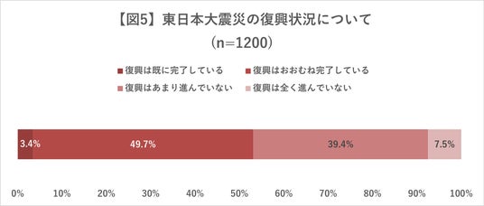 - 東日本大震災の復興状況については、「おおむね完了している」が49.7%(596人)で最多。以下順に、「あまり進んでいない」が39.4%(473人)、「全く進んでいない」が7.5%(90人)、「既に完了している」が3.4%(41人)だった【図5】。