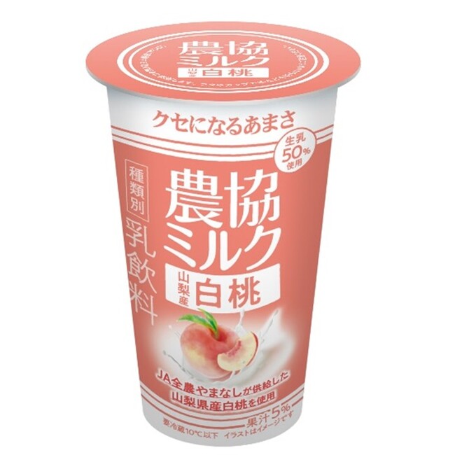 今回発売する『農協ミルク 山梨産白桃』は、協同乳業株式会社がJA全農やまなしと連携し、山梨産白桃の果汁と、生乳を50%使用した飲みきりサイズの新商品です。