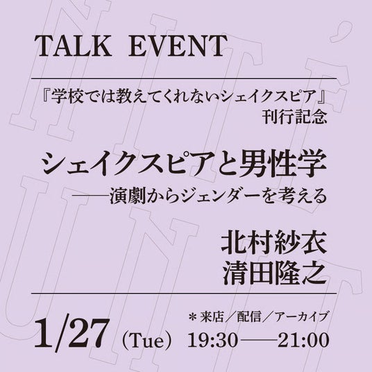 今回は「シェイクスピアと男性学──演劇からジェンダーを考える」をテーマに、著者の北村紗衣さんと、ゲストに文筆家の清田隆之さんをお迎えし、お話しいただきます。