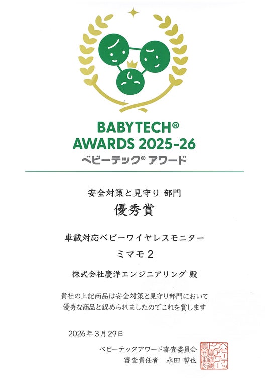 株式会社 慶洋エンジニアリング(本社:東京都港区)は、「KEIYO」ブランドの運転時も振り向かずに子供を見守れる車載対応ベビーモニター「ミマモ2」が「BabyTech(R) Awards 2025-26 安全対策と見守り部門 優秀賞」を受賞した事をお知らせします。