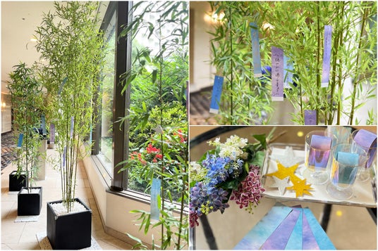 神戸ポートピアホテルでは、2024年7月7日(日)までの期間、七夕飾りを展示いたします。願い事を書いた短冊をご自身で笹に飾っていただける、参加型の展示です。
