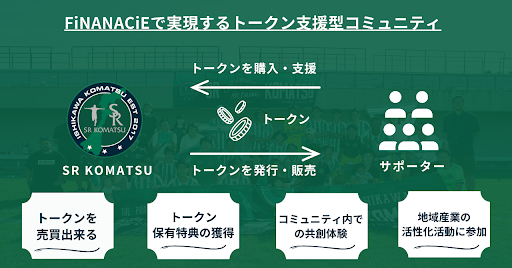 FiNANCiEでは、SR KOMATSUが発行するトークンを活用しファンコミュニティを形成することで、クラブとファンの皆様の関係性を今まで以上により強固なものにし、SR KOMATSUの成長と共に歩んでいくためのコミュニティ運営を支援いたします。