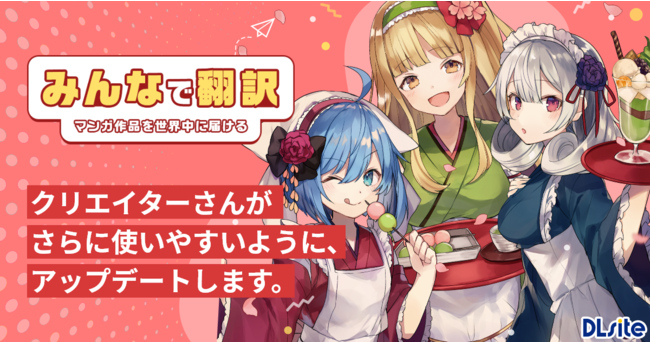 『みんなで翻訳』は、作者が翻訳許可を出した作品に、サービス登録した翻訳者がセリフなどを翻訳し、WEB上で簡単に翻訳作品を作ることができるサービスです。完成した翻訳作品は「DLsite」で販売され、その収益は作者と翻訳者に分配されます。