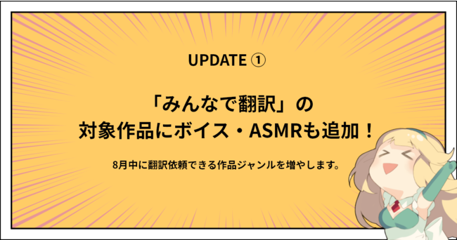 二次元コンテンツのダウンロード販売サイト「DLsite」( https://www.dlsite.com/ 株式会社エイシス、所在地:東京都千代田区、代表取締役:藤井純)では、登録されているマンガ作品に対して誰でも翻訳をおこなえるサービス『みんなで翻訳』を展開しています。8月下旬より、マンガ作品だけでなく、ボイス・ASMR作品も翻訳対象に追加することを決定しました。また、8月22日(月)に翻訳作品登録への参加条件を緩和するため、一部の規約を改定いたします。