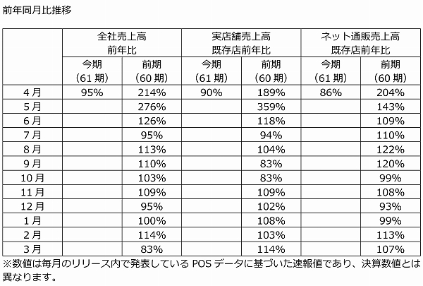 また、ネット通販においては、売上高が前年比86%という結果になりました。