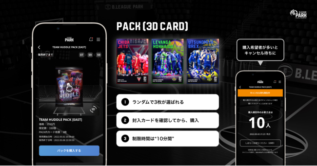 本日20時より、NFTカード3枚入りパックの販売が開始されます。990円、限定1,540パックの「TIP OFF PACK」と、5,555円、限定330パックの「TEAM HUDDLE PACK [EAST]」が第一弾商品となります。さらに第二弾として5.9(月)20:00から「TEAM HUDDLE PACK [WEST]」の販売も予定されています。いずれも期間限定で販売される、貴重なNFTカードとなっております。